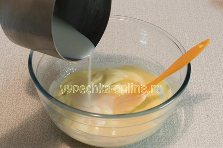 Молоко довела до кипения. Желатин хорошенько отжала и выложила к нему. Тщательно размешала ложкой, дала остыть до тёплой температуры.